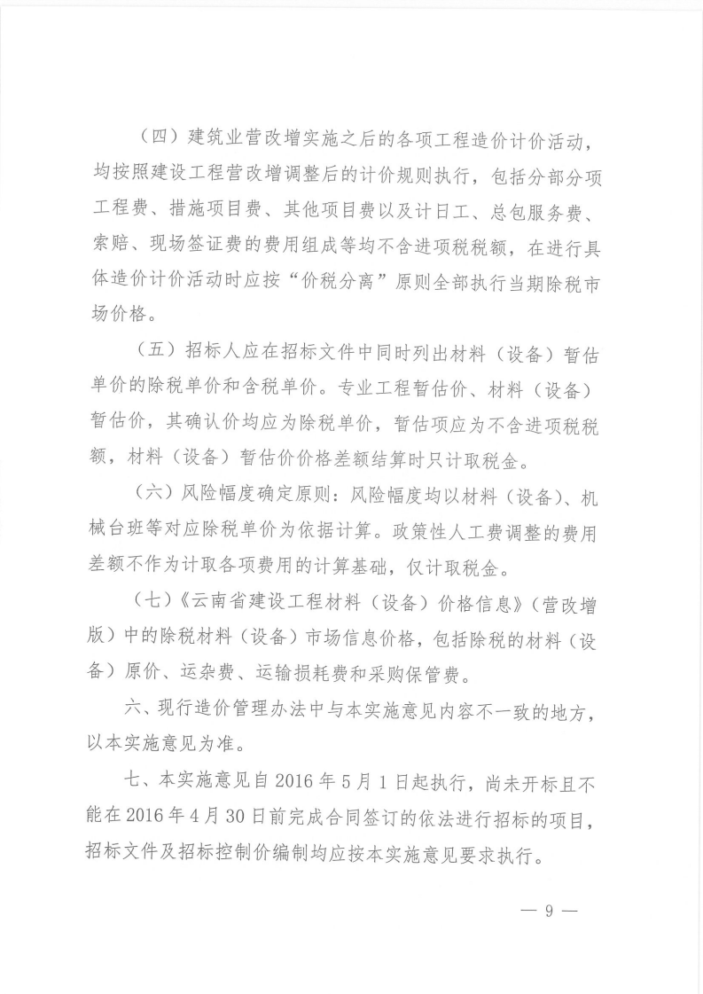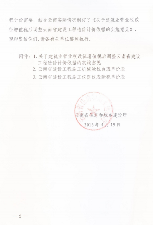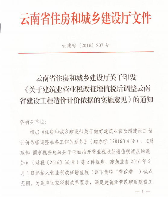 關于建筑業營業稅改征增值稅后調整云南省建設工程造價計價依據的實施意見的通知 云建標[2016]207號