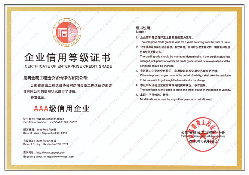 2018年9月29日,中國建設工程造價管理協會對昆明金甌工程造價咨詢評估有限公司的信用狀況進行了評價,評定金甌公司為,并頒發了“企業信用等級AAA級信用企業”等級證書。