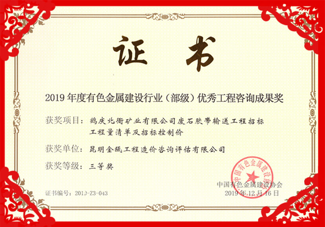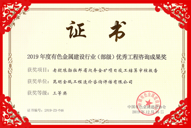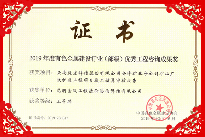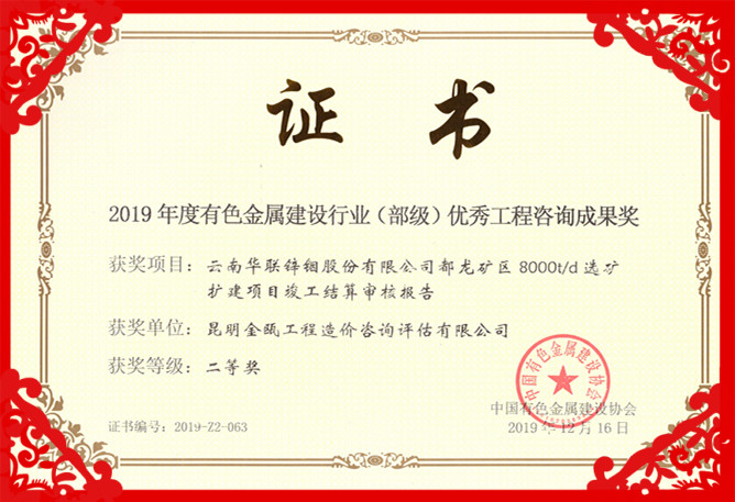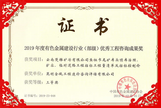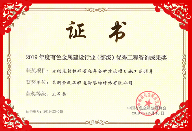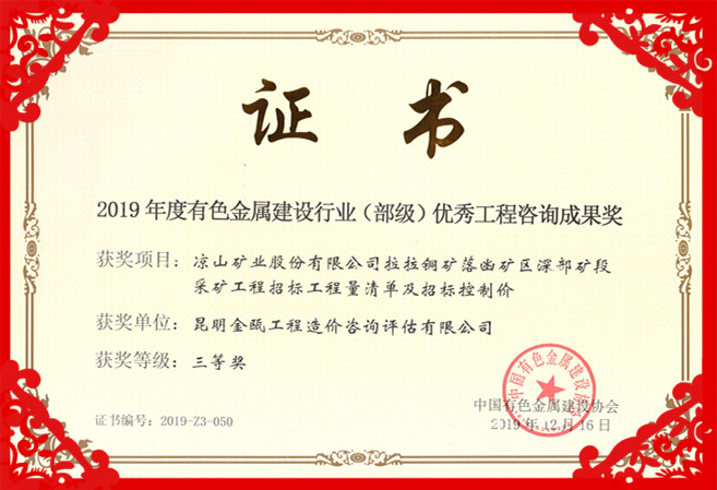 熱烈祝賀昆明金甌工程造價咨詢評估有限公司在2019年度中國有色金屬建設(shè)行業(yè)咨詢成果評獎活動中