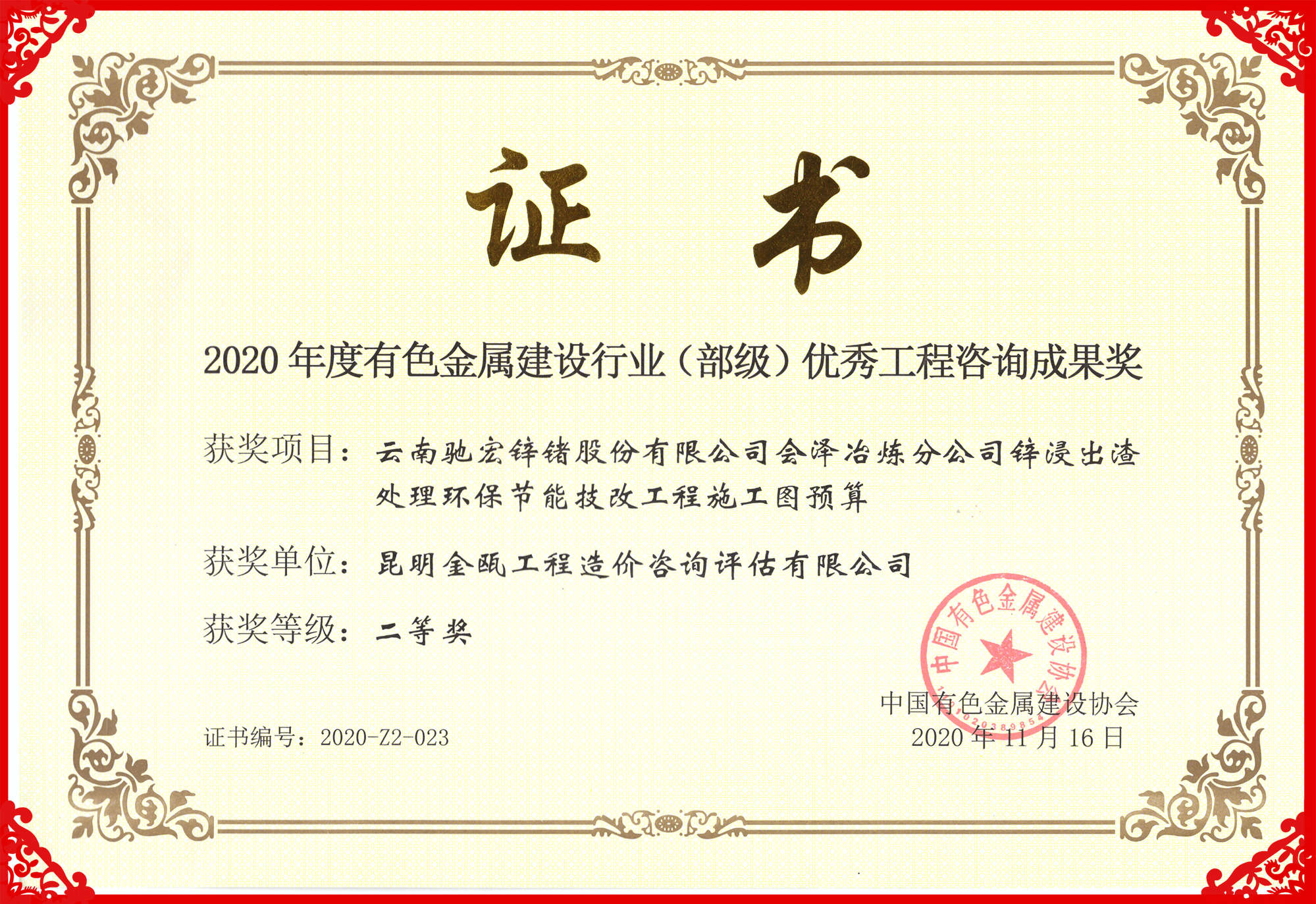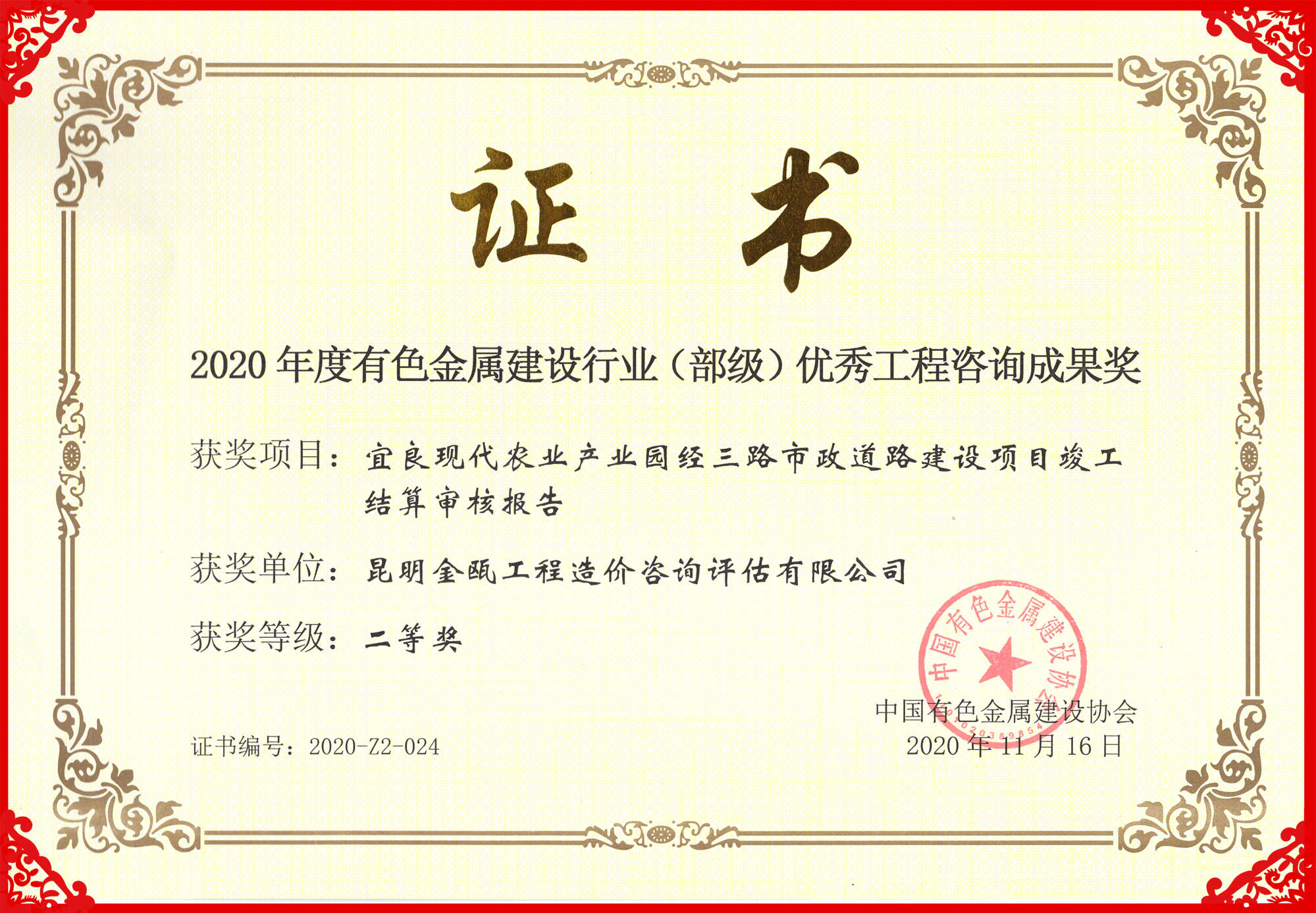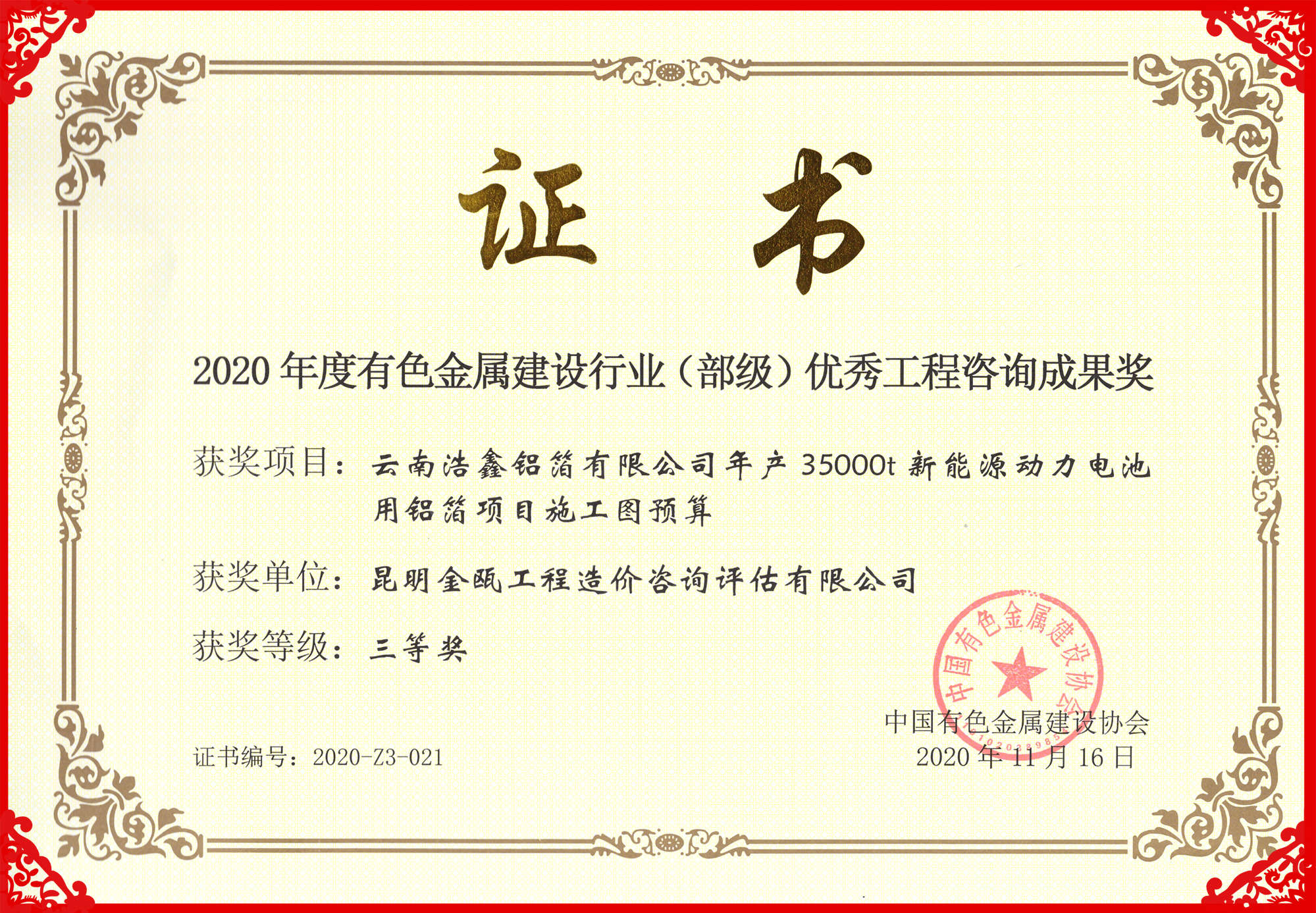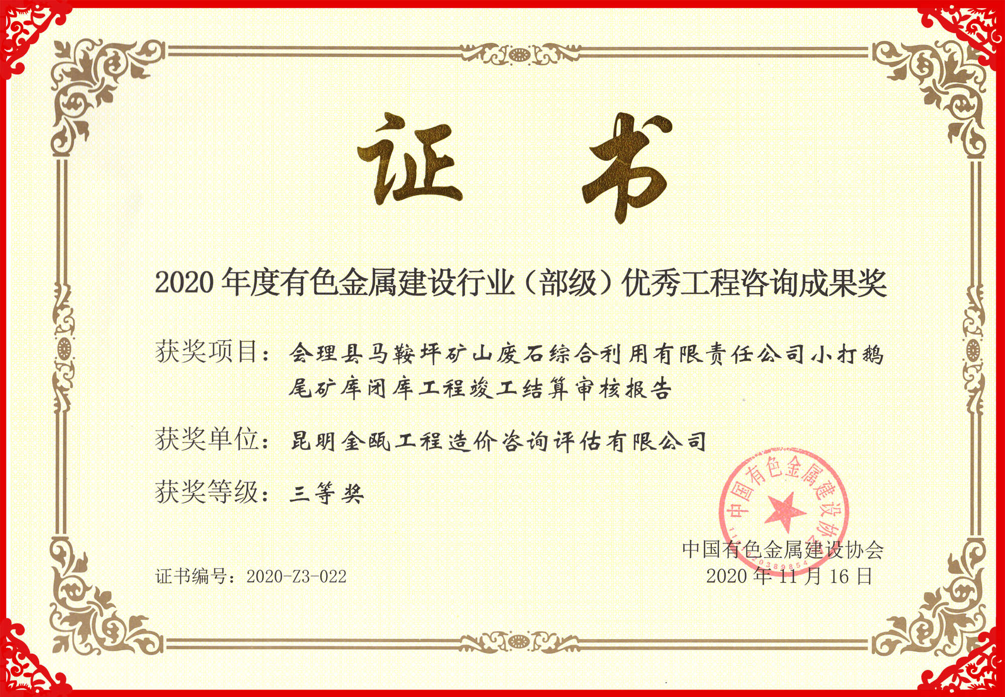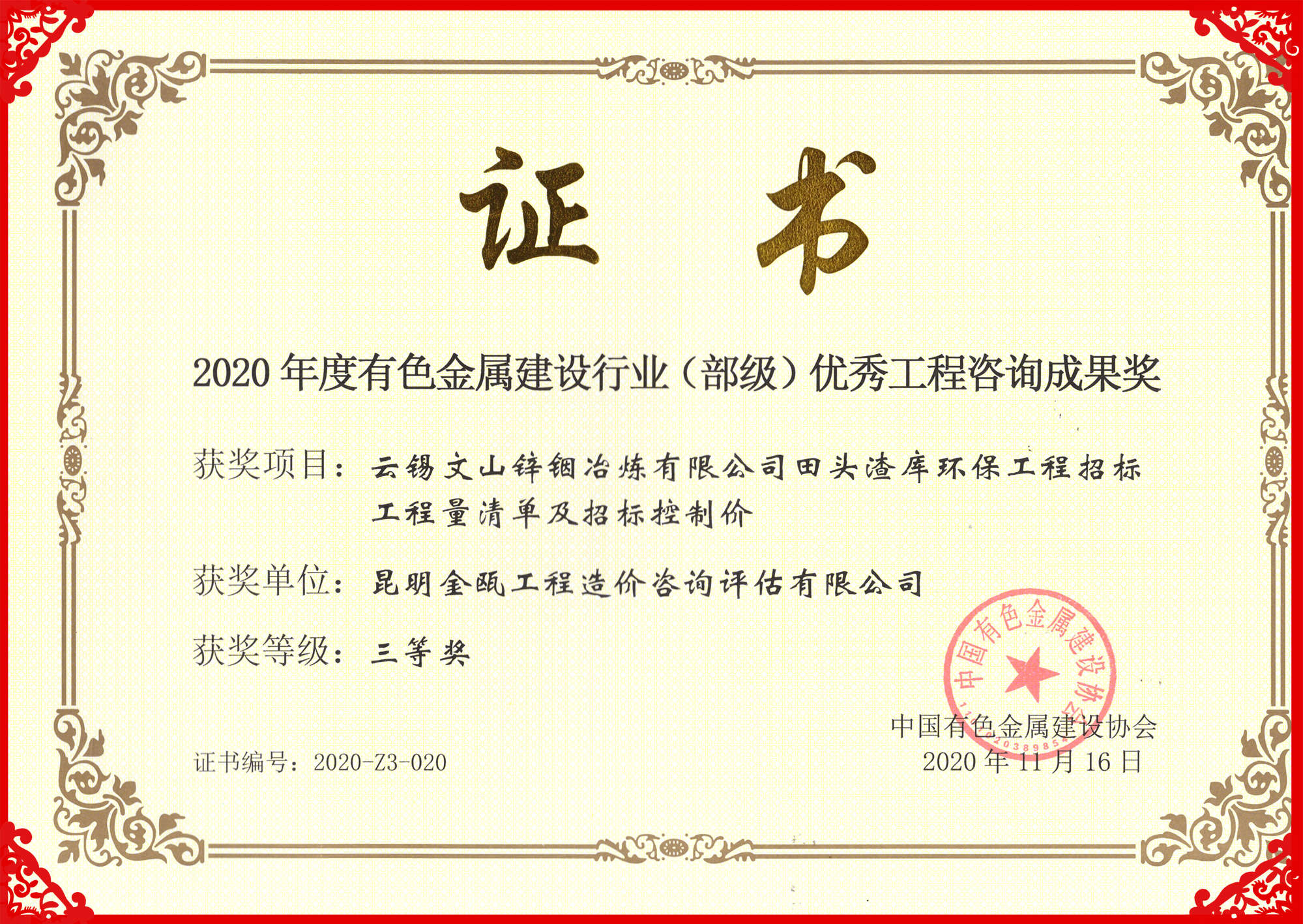 熱烈祝賀昆明金甌工程造價咨詢評估有限公司在2020年度中國有色金屬建設行業咨詢成果評獎活動中