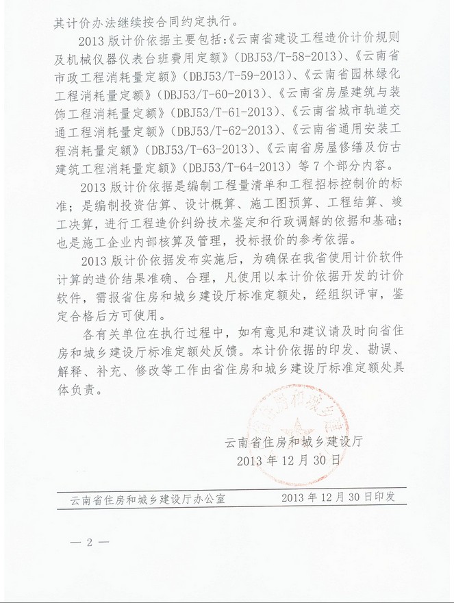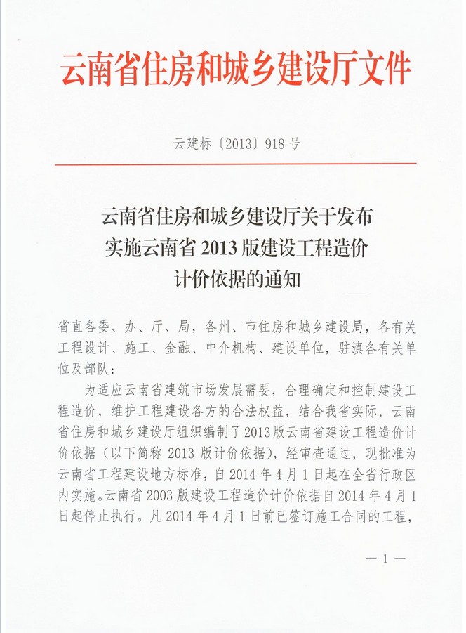 云南省住房和城鄉建設廳關于發布實施云南省2013版建設工程造價計價依據的通知