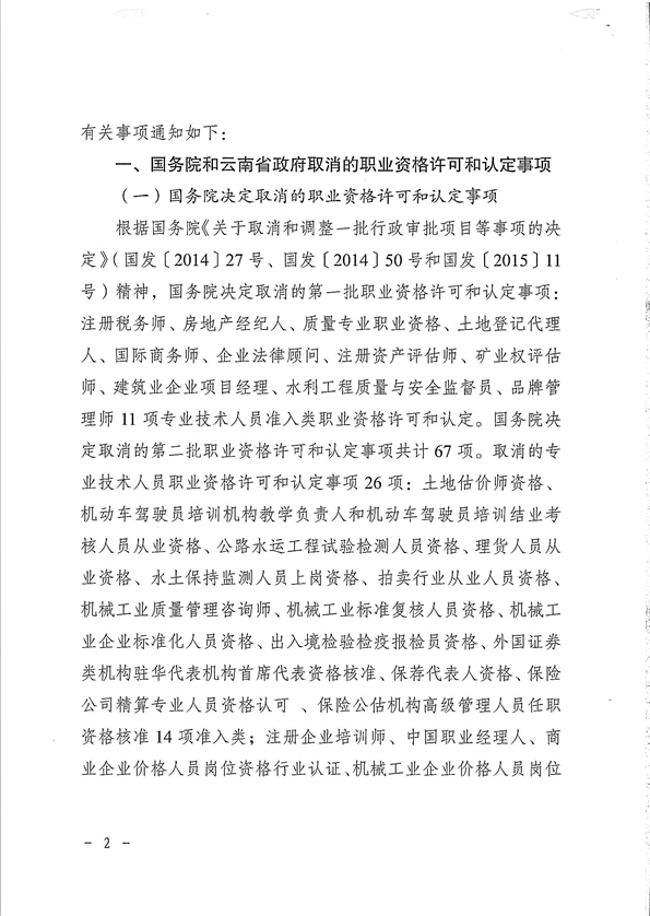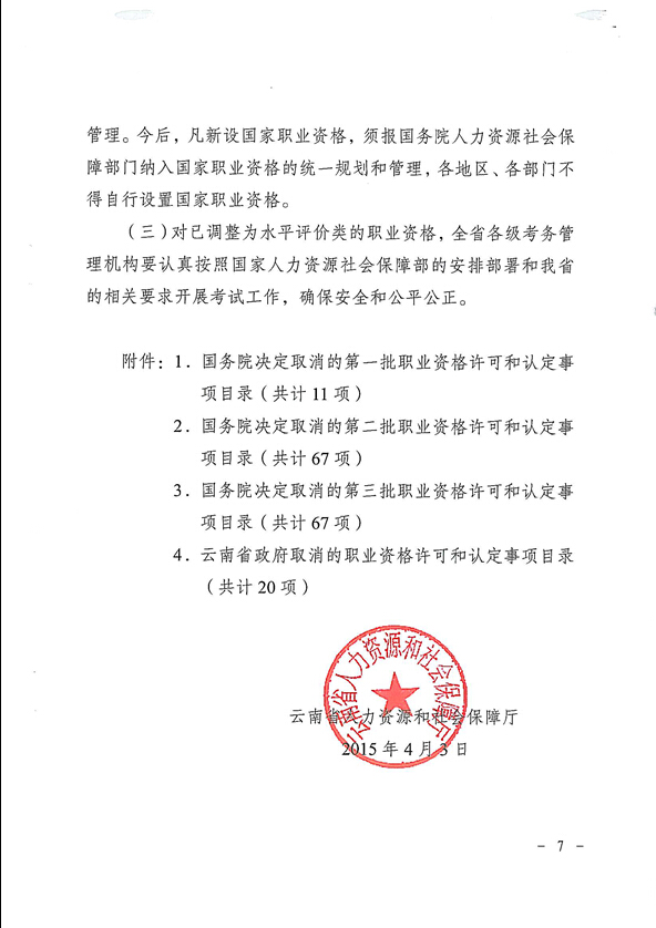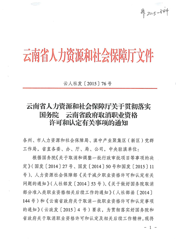 省人力資源和社會保障廳關于貫徹落實國務院云南省政府取消職業資格許可和認定有關事項的通知